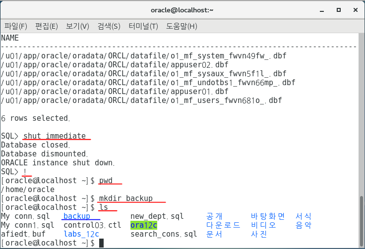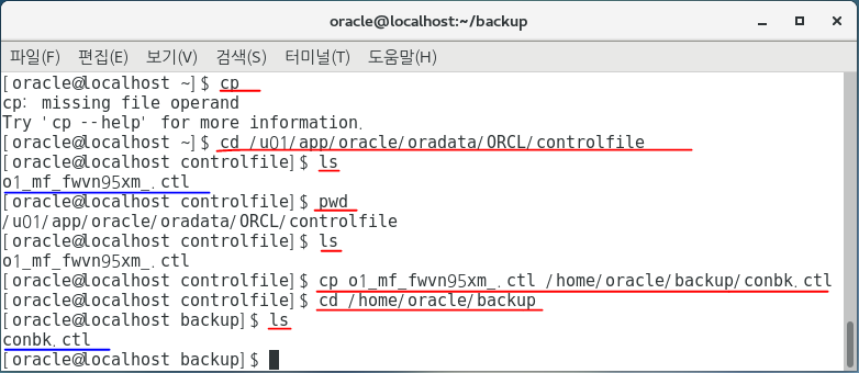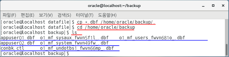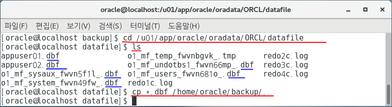 가. User 관리 방식의 백업 및 복구 : 운영체제 명령어(cp)를 사용한 백업 및 복구.
