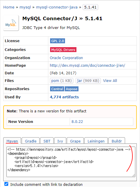 https://mvnrepository.com/artifact/mysql/mysql-connector-java/5.1.41 → MySQL Connector Java 5.1.41