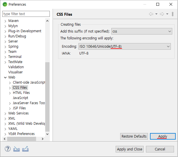 Window → Preferences → Web → Css Files → Encoding: UTF-8 →Apply