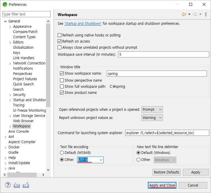 Preferences → Workspace → Text file encoding → Other: UTF-8 →Apply and Close