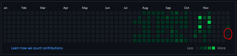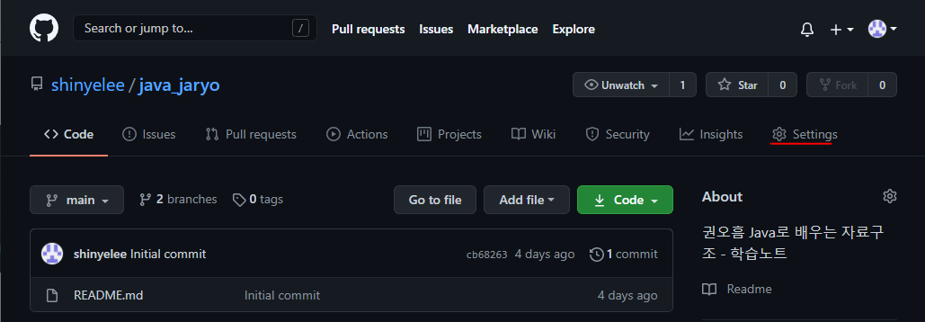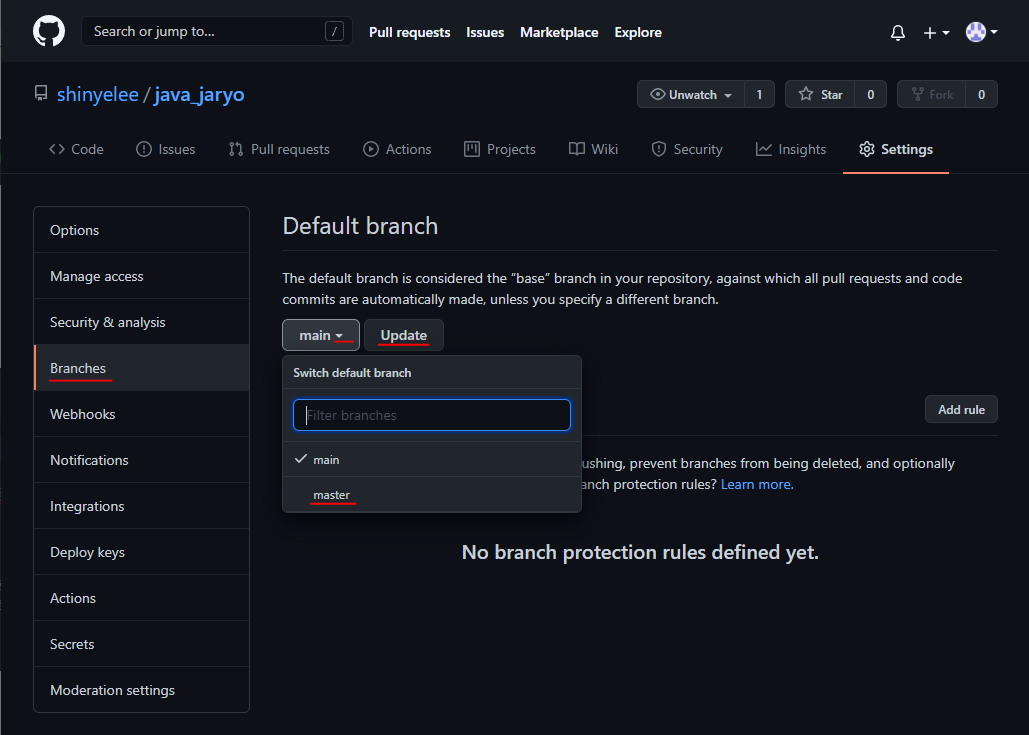 구글링해보니 디폴트 브랜치와 커밋한 브랜치가 다르면 잔디가 안 심긴다고 한다. 문제의 레포에서 Settings 클릭현재 디폴트 브랜치는 main. master에서 커밋을 했으니 디폴트 브랜치를 바꿔주자. Branches → main → master → Update대충 디폴트 브랜치 바꿔서 망해도 어쩔 수 없다는 경고 문구다. 버튼 클릭main이 아닌 master 브랜치가 뜨는 걸 보니 성공한 듯?누락된 잔디가 제대로 심겨 있다!