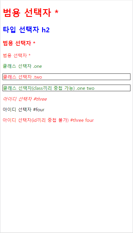 <p id="three four">아이디 선택자(id끼리 중첩 불가) #three four</p>