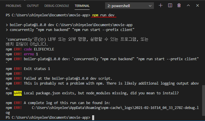 Node.js yarn 에러. yarn dev 명령어 실행시 yarn run v1.22.4 warning package.json: No license field $ concurrently --kill-others-on-fail "yarn sever" "yarn client" 'concurrently'은(는) 내부 또는 외부..
