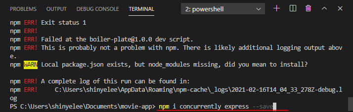 노드 api 서버 npm install 시 발생하는 에러 - 인프런