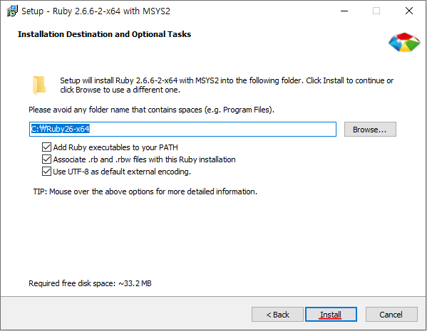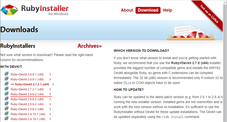Which version to download? If you don’t know what version to install and you’re getting started with Ruby, we recommend that you use the Ruby+Devkit 2.7.X (x64) installer. It provides the biggest number of compatible gems and installs the MSYS2 Devkit