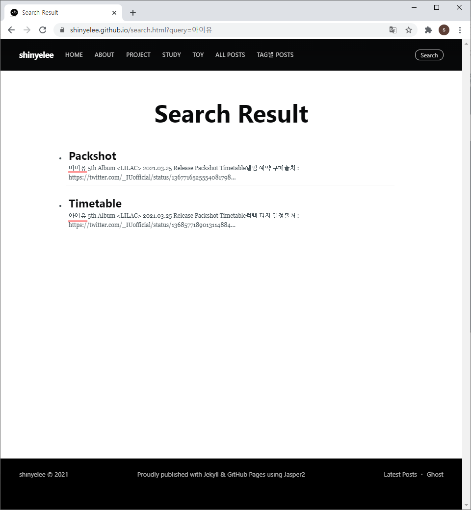 | [Git/GitHub] Jekyll 기반의 GitHub Page 생성(5) - lunr.js를 이용한 Search 기능 추가 (1) (0) | 2021.03.14 |