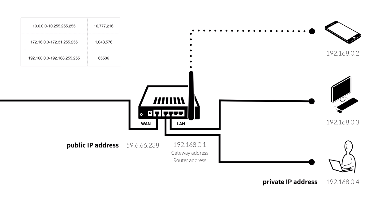 공유기를 사용하는 가정집, 학교, 회사, 사무실 등에서는 여러 개의 공인 IP를 부여하는게 아니라 하나의 공인 IP로 묶은 후 기기마다 사설 IP를 부여한다. 이러한 방식으로 한정된 (공인)IP 자원을 아낄 수 있다. 사설 IP를 쓰는 기기는 공인 IP를 쓰는 컴퓨터로 접근할 수 있지만, 외부 컴퓨터에서 사설IP를 쓰는 컴퓨터로는 접근할 수 없다. 왜? 싶지만 당연하다. 내선번호만 아는 상태로 다른 회사에 전화를 걸 수는 없는 것이다. 이러한 이유로 서버들은 대부분 공인 IP를 가진다.