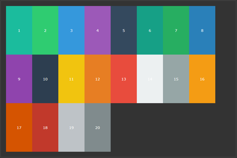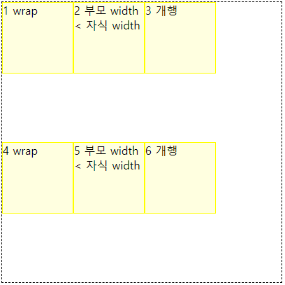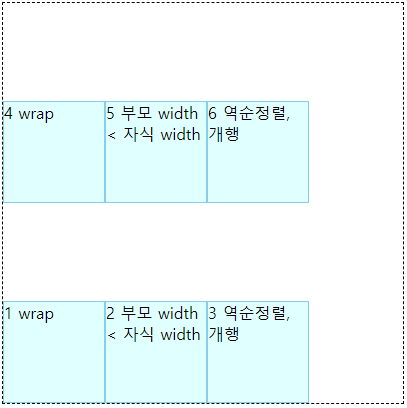 flex-wrap: nowrap;도 flex-direction: row처럼 기본값이다.flex-wrap: wrap;은 부모의 공간이 부족하면 box 단위로 개행함.flex-wrap: wrap-reverse;는 거꾸로(밑에서 위로) 개행함.상하 180도 뒤집은 것이기 때문에,여백 위치도 거꾸로가 된다.