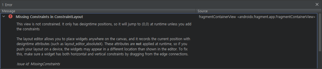 Android : missing constraints in constraintlayout 해결방법