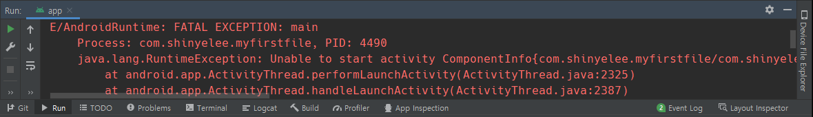Process: com.shinyelee.myfirstfile, PID: 4490