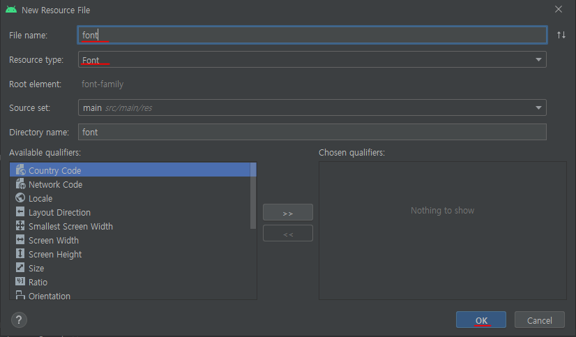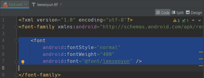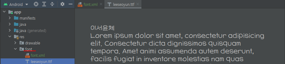 XML의 글꼴 Android 8.0(API 수준 26)에는 새로운 기능인 XML의 글꼴이 도입되어 글꼴을 리소스로 사용할 수 있습니다. res/font/ 폴더에 font 파일을 추가하여 글꼴을 번들로 묶어 리소스로 사용할 수 있습