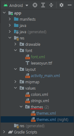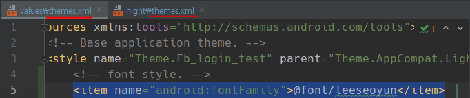 // themes.xml 파일에서 style 하위에 아래처럼 코드 작성