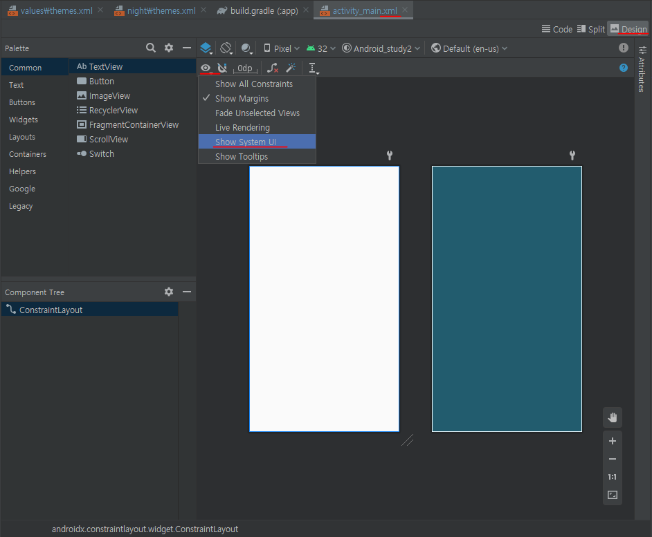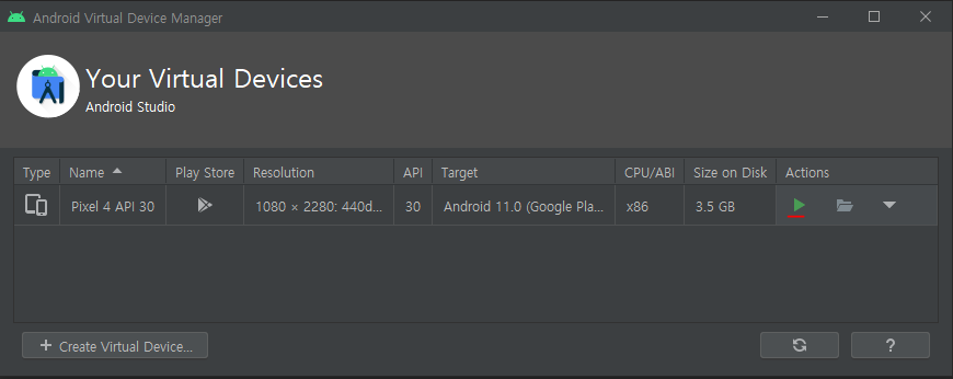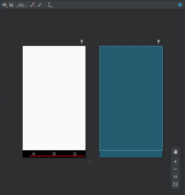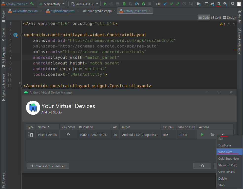 잃어버린 하단바를 찾습니다 아무 xml파일에 들어가서 - Design 탭 - 눈 모양 아이콘 - Show System UI 선택 하단바가 다시 생긴 줄 알았는데 안 됨 그렇다면 화면 우측 상단 Android Virtual Device Manager에 들어가 데이터를 지워준다 뭐 잘못 건드린 게 없는데 문제가 생긴다면 의외로 무식하게 껐다 켜는 것도 좋은 방법이다 해결!