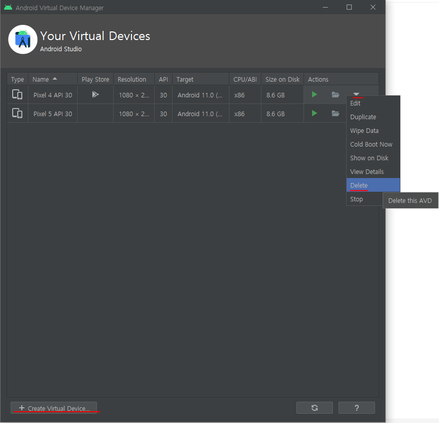 해결 방법 (3) Android Virtual Device Manager에서 기존 가상기기 삭제 후 새로 만들기