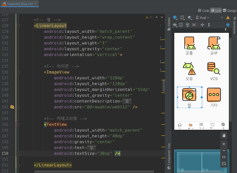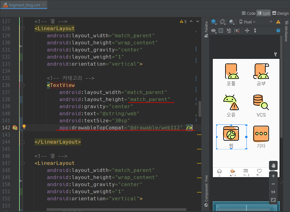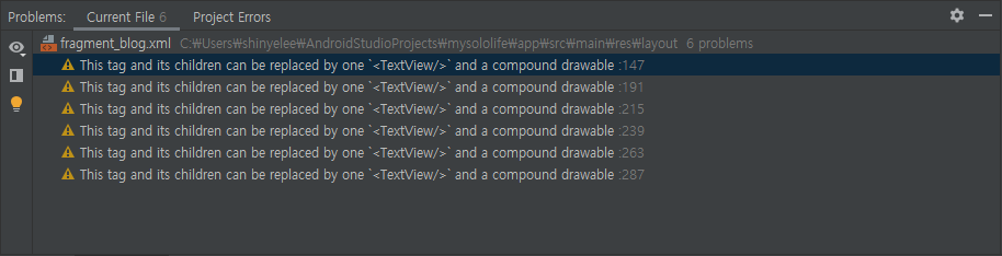 [안드로이드 스튜디오] 이 태그(뷰)와 자식(뷰)들은 하나의 <텍스트뷰/>와 복합 드로어블로 대체될 수 있음