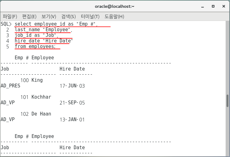 1. employees 테이블로부터 employee_id, last_name, job_id, hire_date를 출력하되 컬럼 제목을 각각 Emp #, Employee, Job, Hire Date로 지정하여 출력하시오.