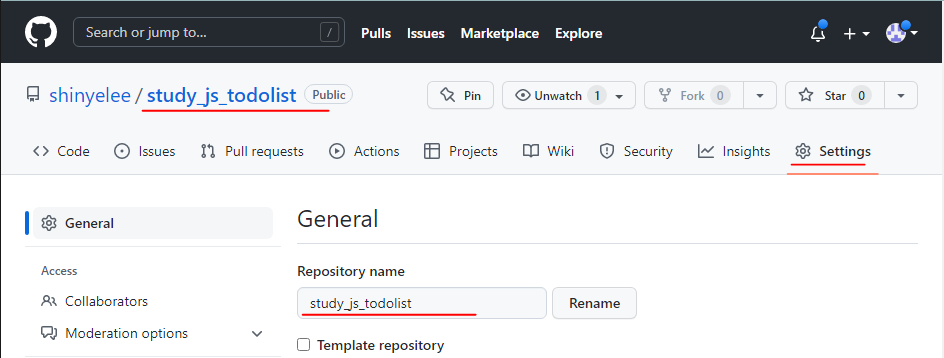 Repository 이름을 변경하고 로컬 저장소에서 변경된 remote 저장소의 URL로 재설정하는 방법에 대해서 알아보겠습니다. [Step 1] 변경할 Repository에서 Setting 클릭 [Step 2] 이름을 변경하고 Rename 클릭 [S..