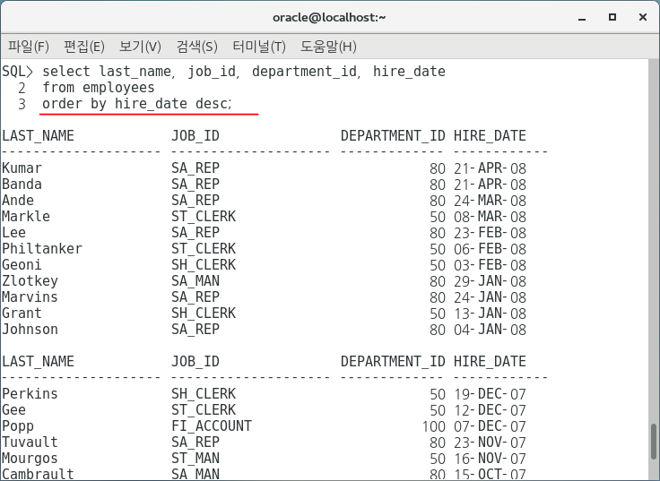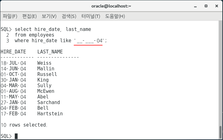 나. employees 테이블로부터 04년도에 입사한 모든 사원의 last_name과 hire_date를 출력하시오.