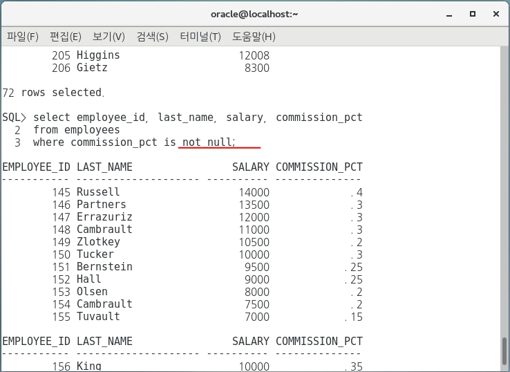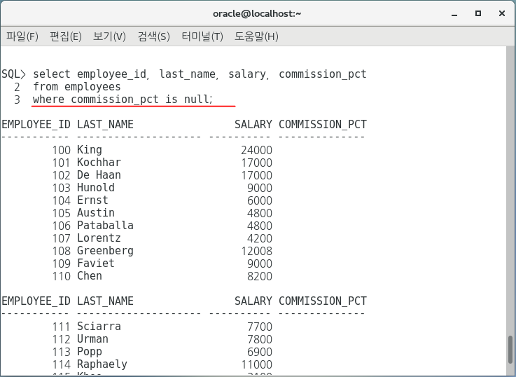 가. employees 테이블로부터 사원들의 employee_id, last_name, salary, commission_pct를 출력하되 커미션을 받지 않는 사원만 출력하는 구문을 작성하시오.