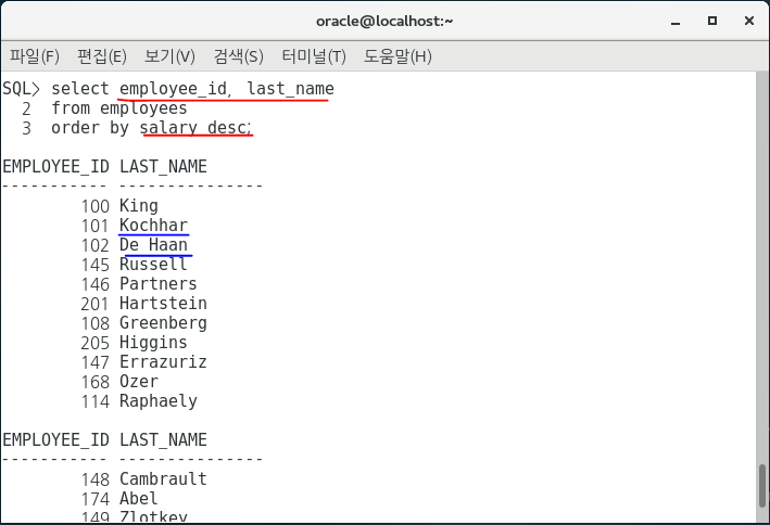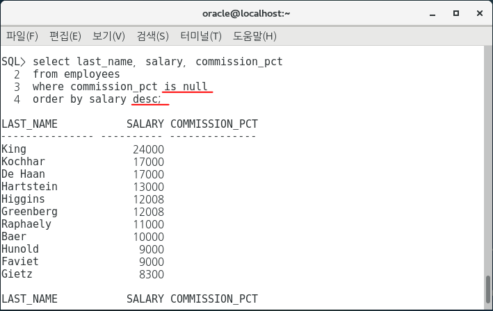 가. employees 테이블로부터 커미션을 받지 않는 모든 사원의 last_name, salary, commission_pct를 출력하되 salary를 기준으로 내림차순 정렬하시오.