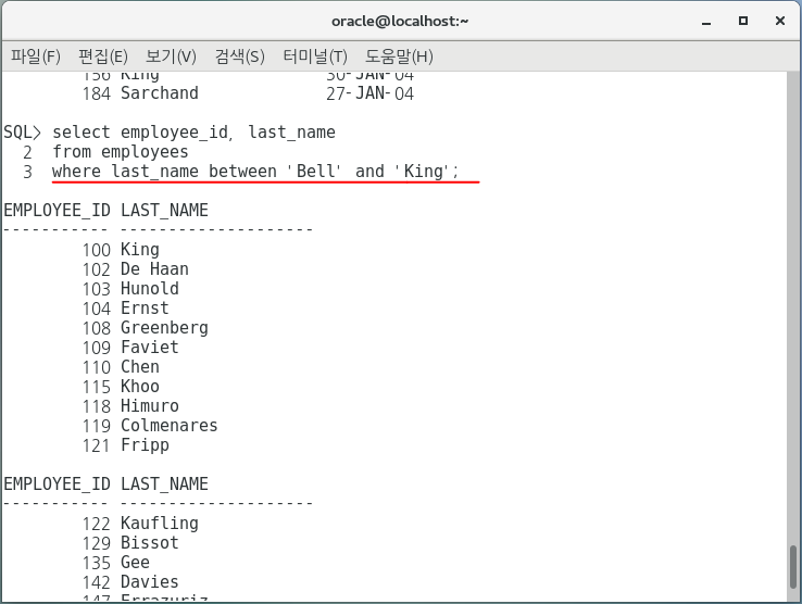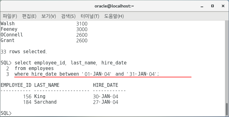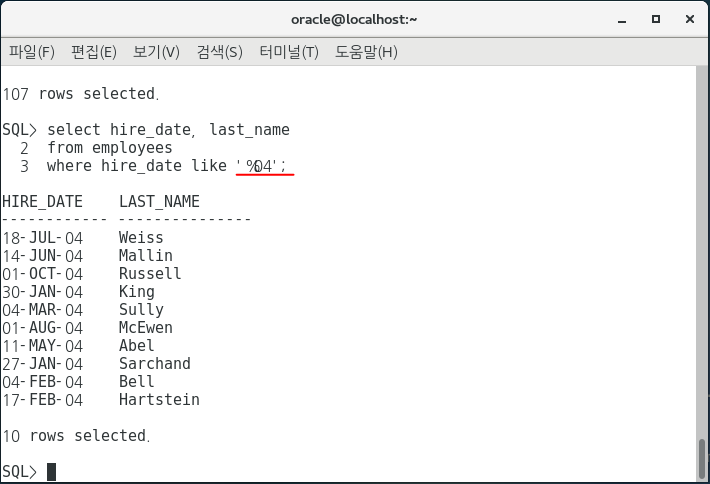 나. employees 테이블로부터 04년도에 입사한 모든 사원의 last_name과 hire_date를 출력하시오.