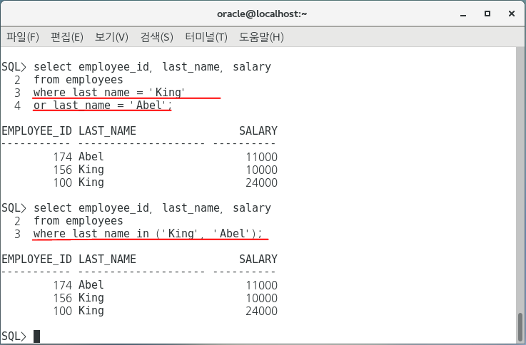 | in (의미 : or) | ↔ | not in (의미 : and) |
