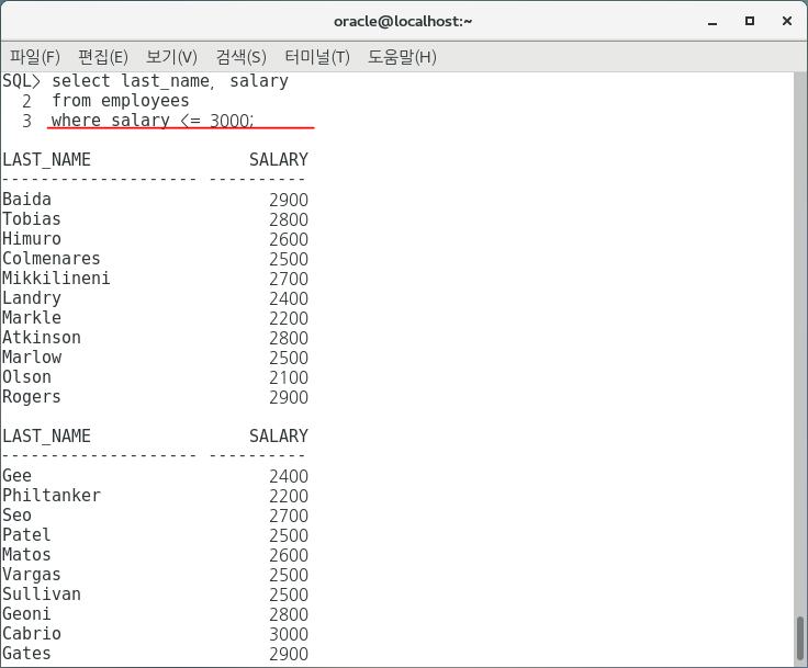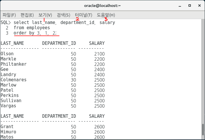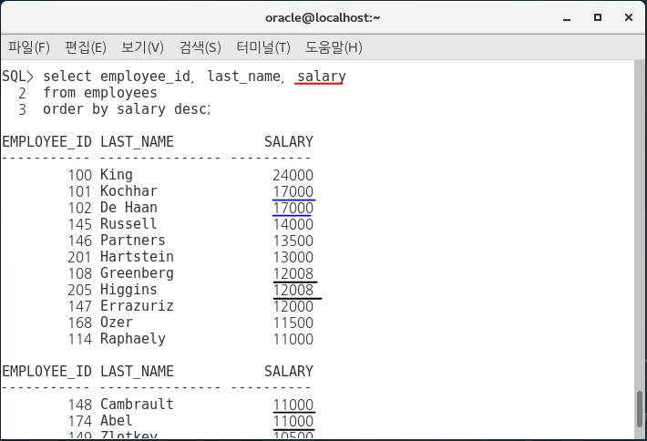 가. employees 테이블로부터 커미션을 받지 않는 모든 사원의 last_name, salary, commission_pct를 출력하되 salary를 기준으로 내림차순 정렬하시오.