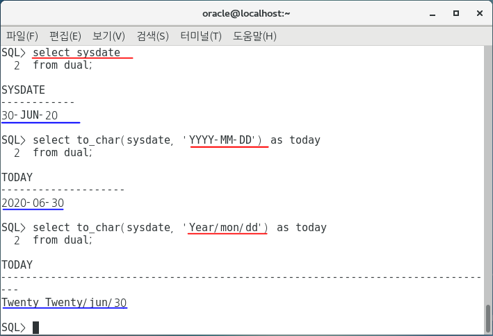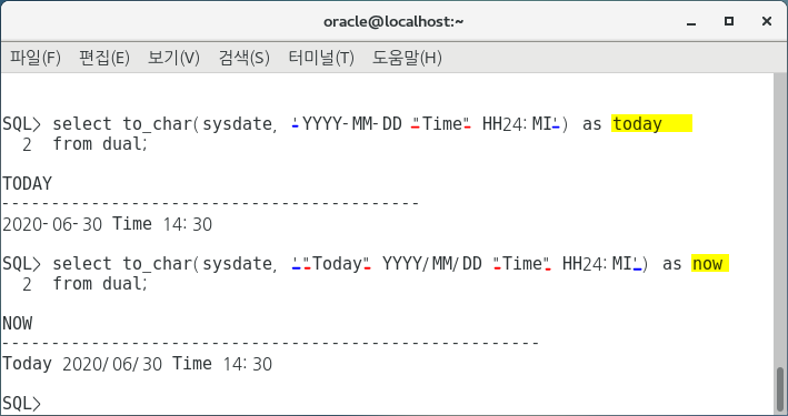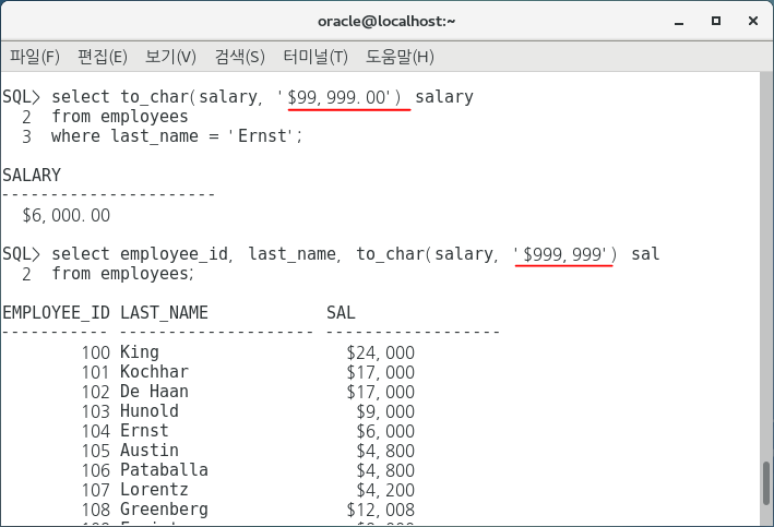 * alias와 to_char 외에는 큰 따옴표("")를 사용하지 않는다.