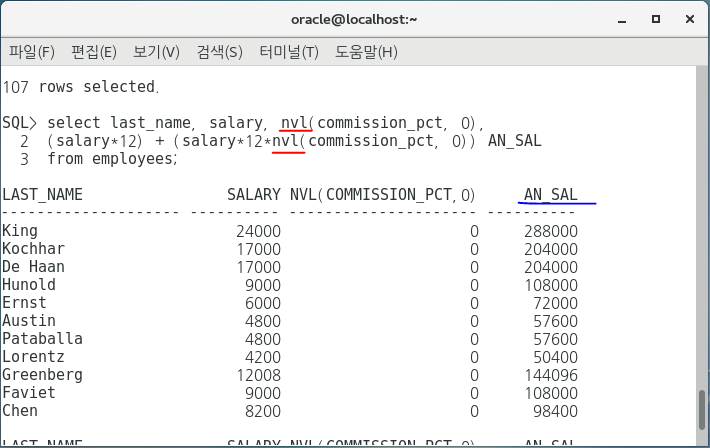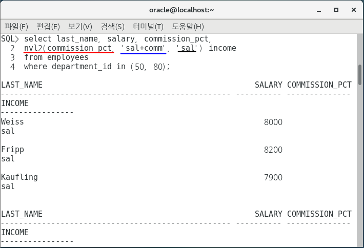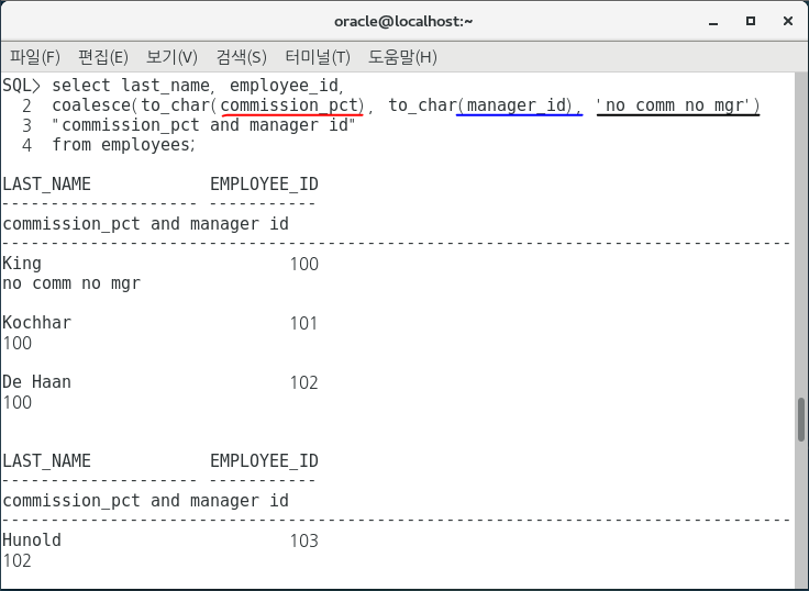 2. employees 테이블로부터 사원들의 last_name과 commission_pct를 출력하되 커미션을 받지 않는 사원들은 "No Commission"이라고 출력하는 구문을 작성하시오.