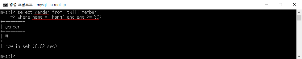 다. itwill_member에서 이름이 kang이면서 나이가 30살 이상인 회원의 성별만 출력.