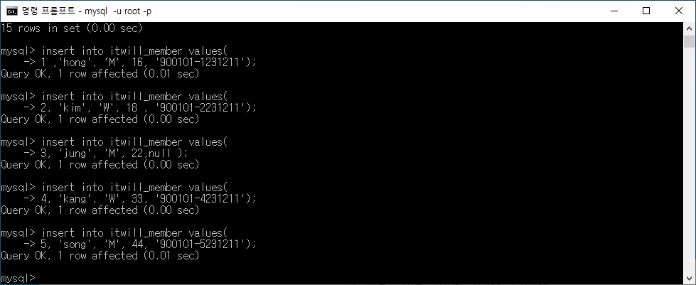 라. itwill_member에 아래 데이터를 차례로 추가하시오.