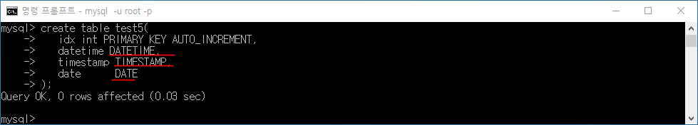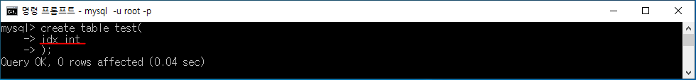 가. 테이블(test)과 필드(idx 정수형)를 생성하시오.