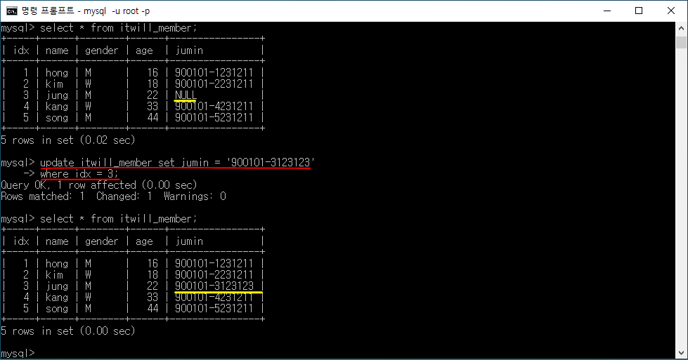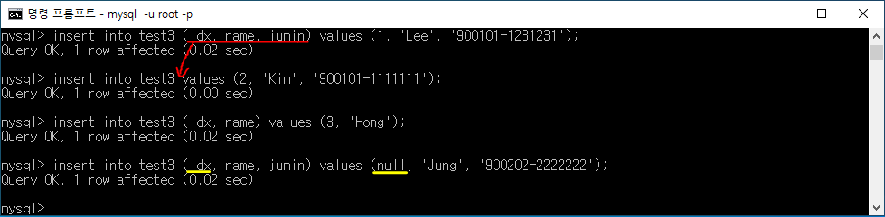 다. test3 필드(idx, name, jumin)에 아래 데이터를 차례로 추가하시오.