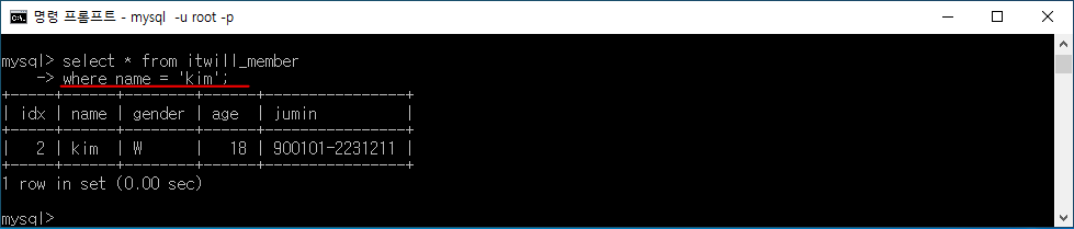 나. itwill_member에서 이름이 kim인 회원의 모든 데이터 출력.