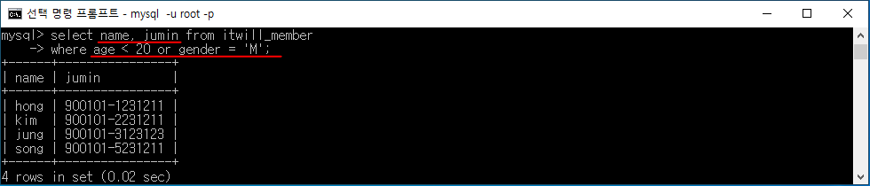 라. 나이가 20살 미만 이거나 성별이 남자(M)인 회원의 이름과 주민번호 출력.