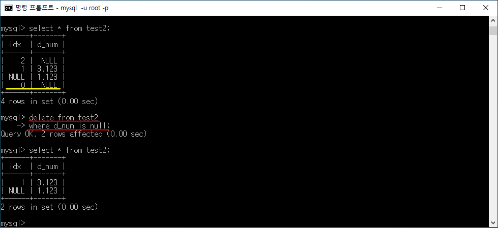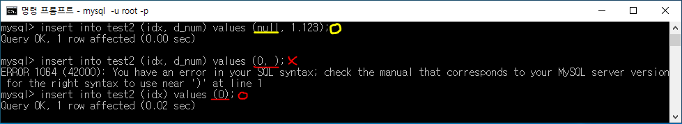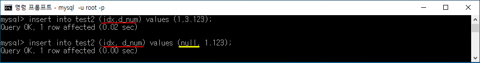 나. test2 필드(idx, d_num)에 데이터(1, 3.123)( , 1.123)(0, )를 차례로 추가하시오.