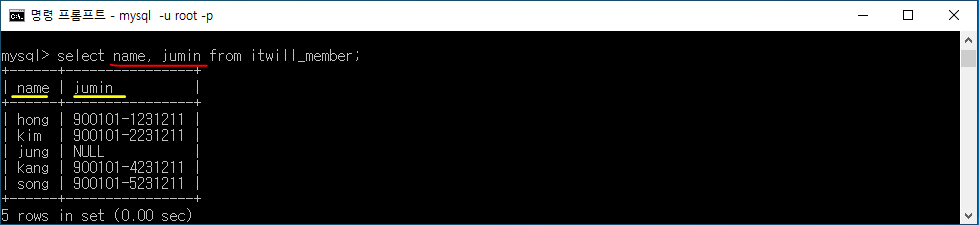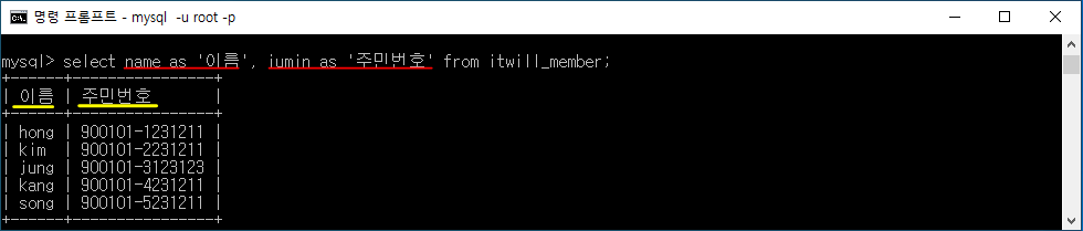 마. name을 이름, jumin을 주민번호로 바꿔 출력.