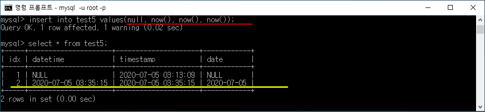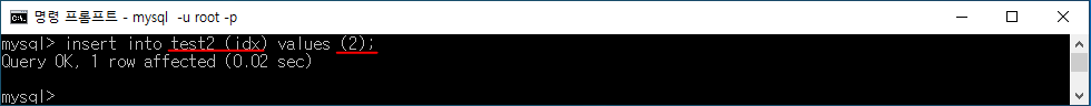 가. test2 필드(idx)에 데이터(2)를 추가하시오.