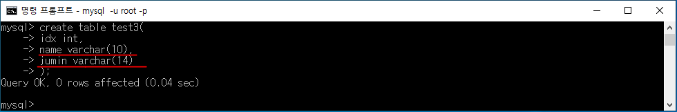 다. 테이블(test3)과 필드(idx 정수형, name 문자형 10자제한, jumin 문자형 10자제한)를 생성하시오.