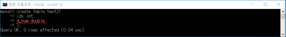 나. 테이블(test2)과 필드(idx 정수형, d_num double)를 생성하시오.