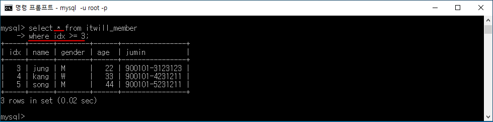 가. itwill_member에서 idx가 3 이상인 회원의 모든 데이터 출력.