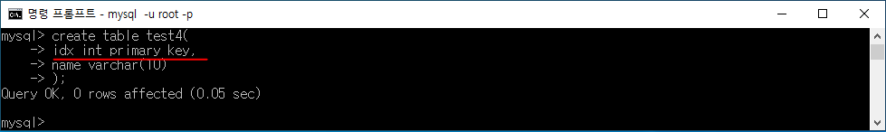 라. 테이블(test4)과 필드(idx 정수형 PK제약조건, name 문자형 10자제한)를 생성하시오.