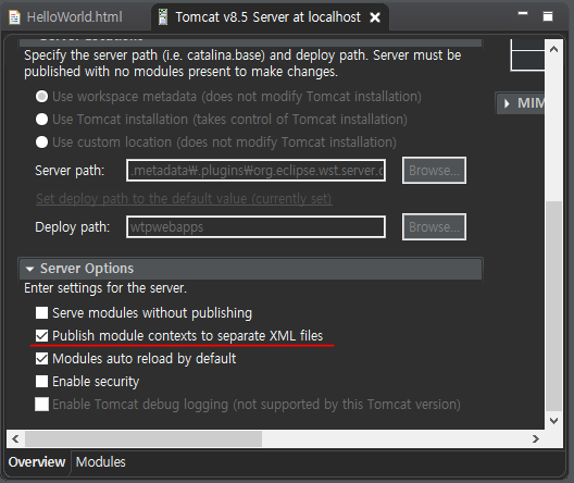 하는 김에 Server Options의 Publish module contexts to separate XML files에도 체크변경사항 저장 후 html파일을 다시 실행하려고 했으나...왜죠The server cannot be saved for the following reasons: [Overview] The server must be stopped before a change to the "Publish module contexts to separate XML files" setting can be saved. → 대충 설정을 변경하기 전 서버를 반드시 정지해야 변경사항이 저장된다는 내용